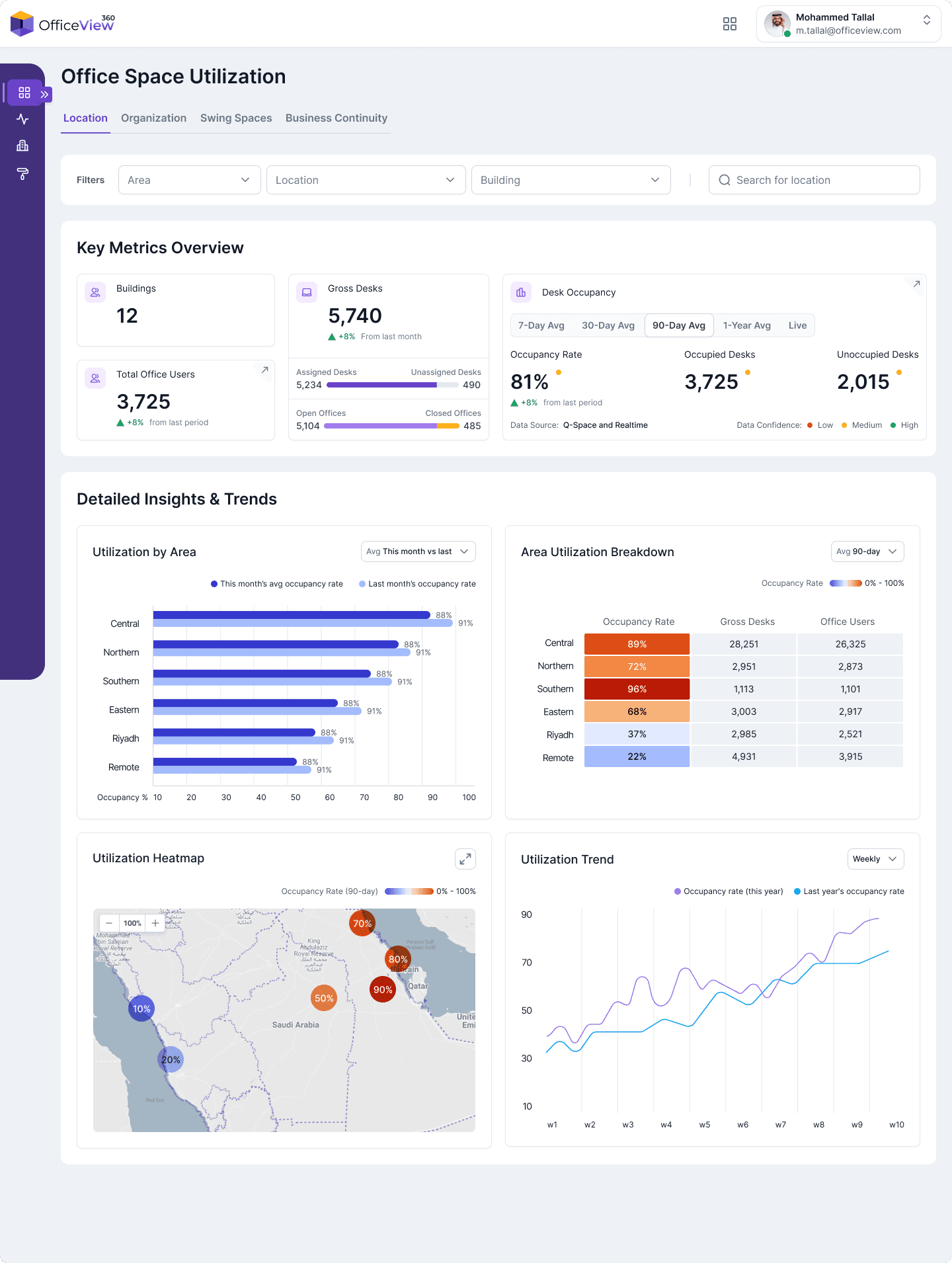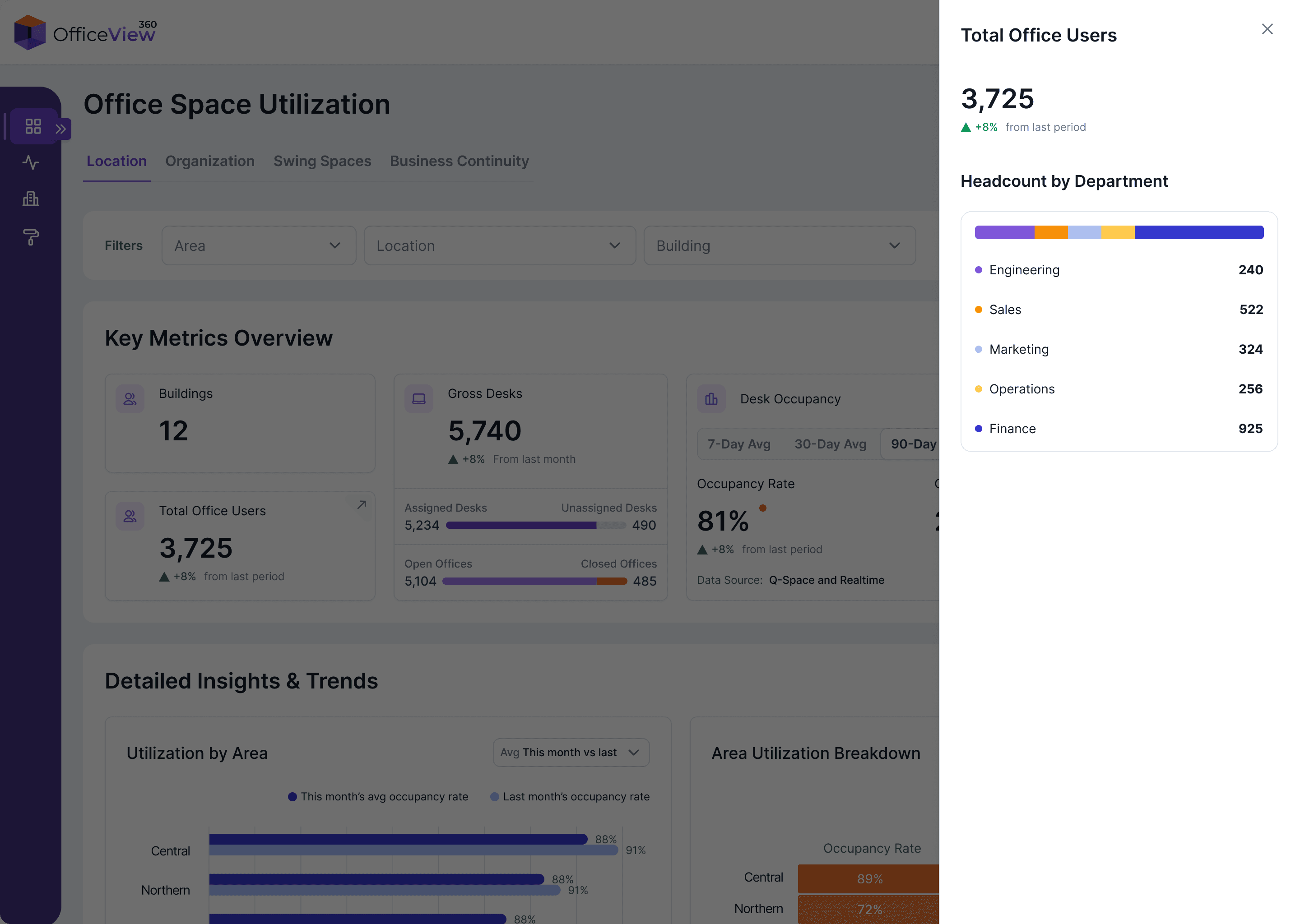 Location View: A high-level view of office occupancy when filtered by building and geographic hierarchy