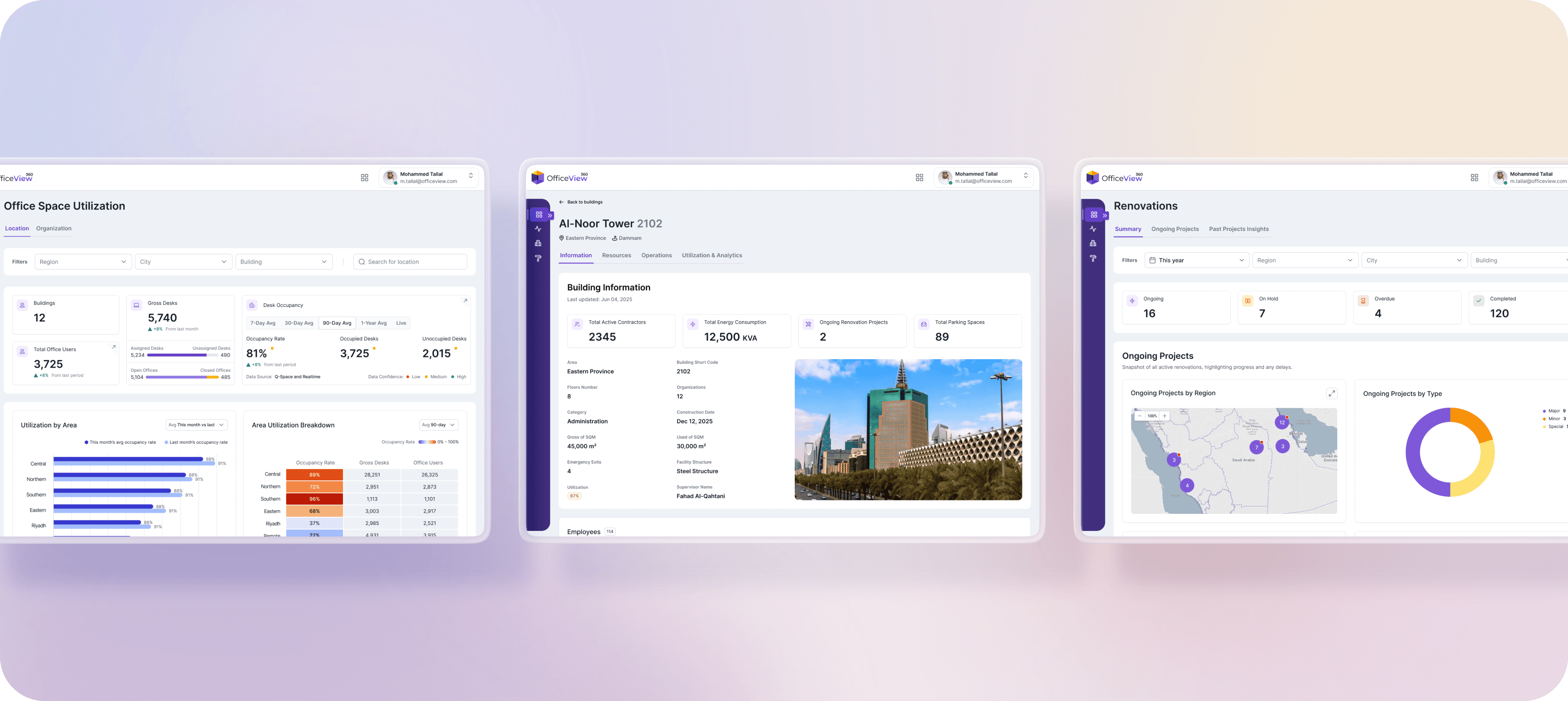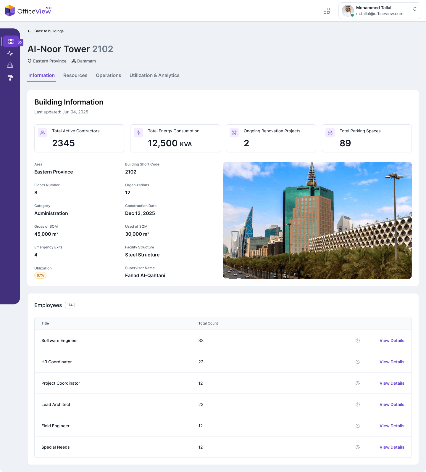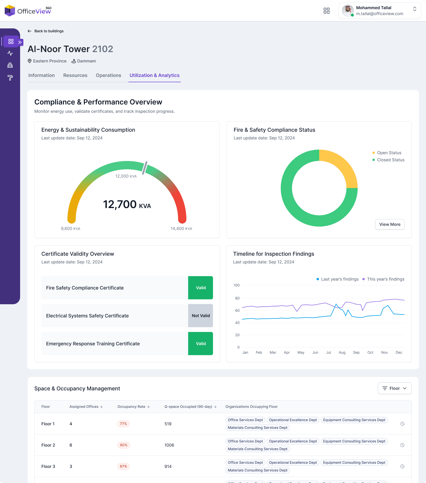 Beyond utilization, we designed a single place to view a building’s full context: facilities, assets, employees, safety status, renovation progress, and key metrics. This helped leadership understand what was happening in each building without needing separate reports from multiple teams.