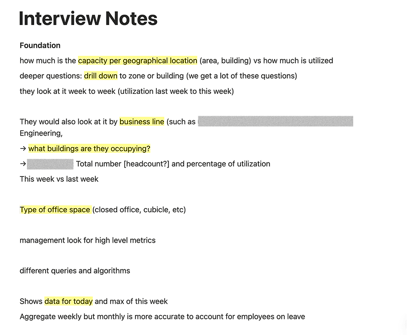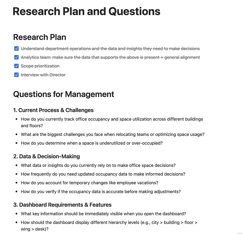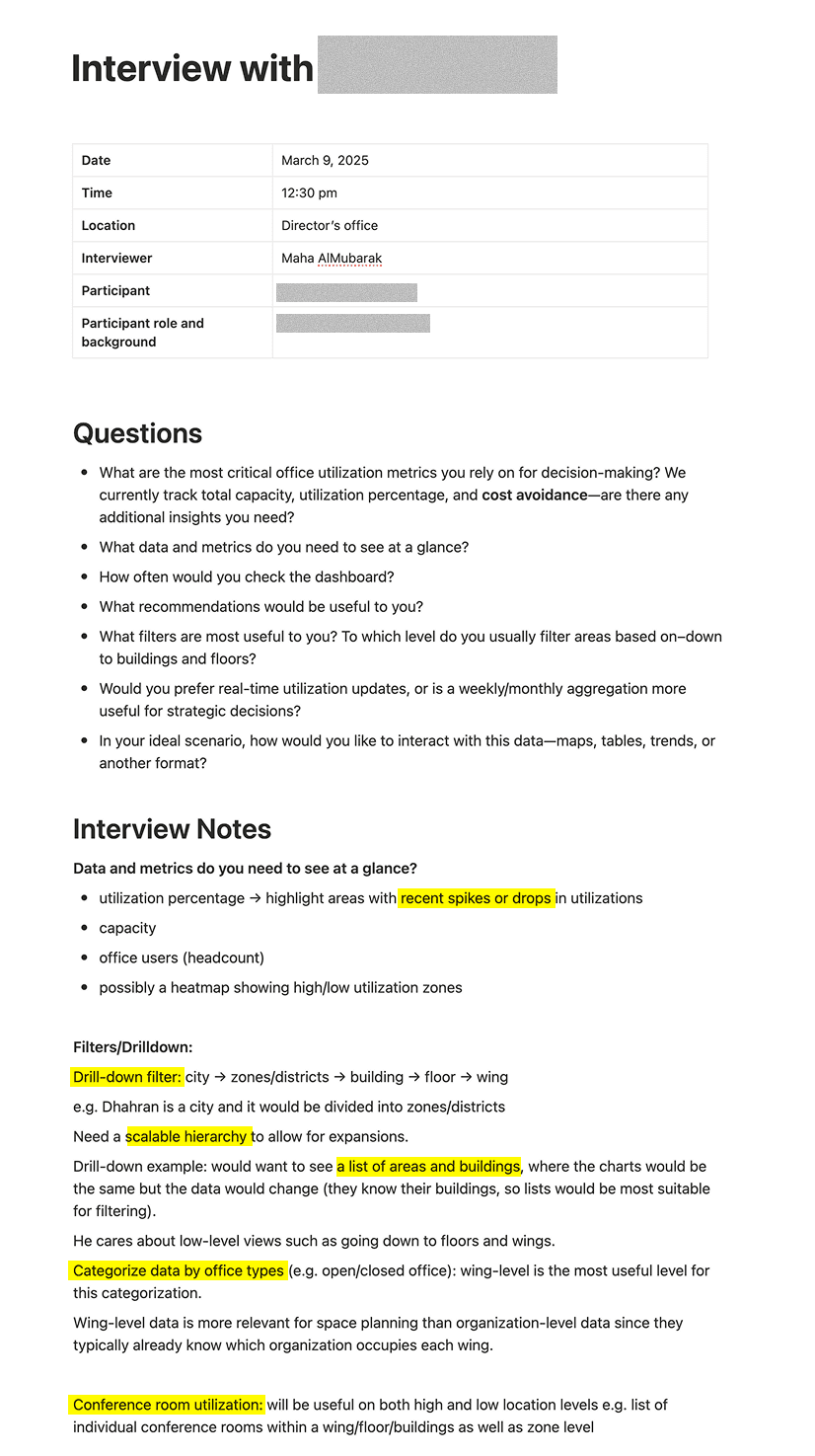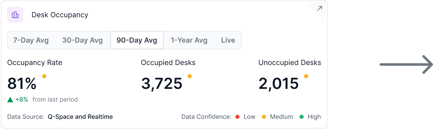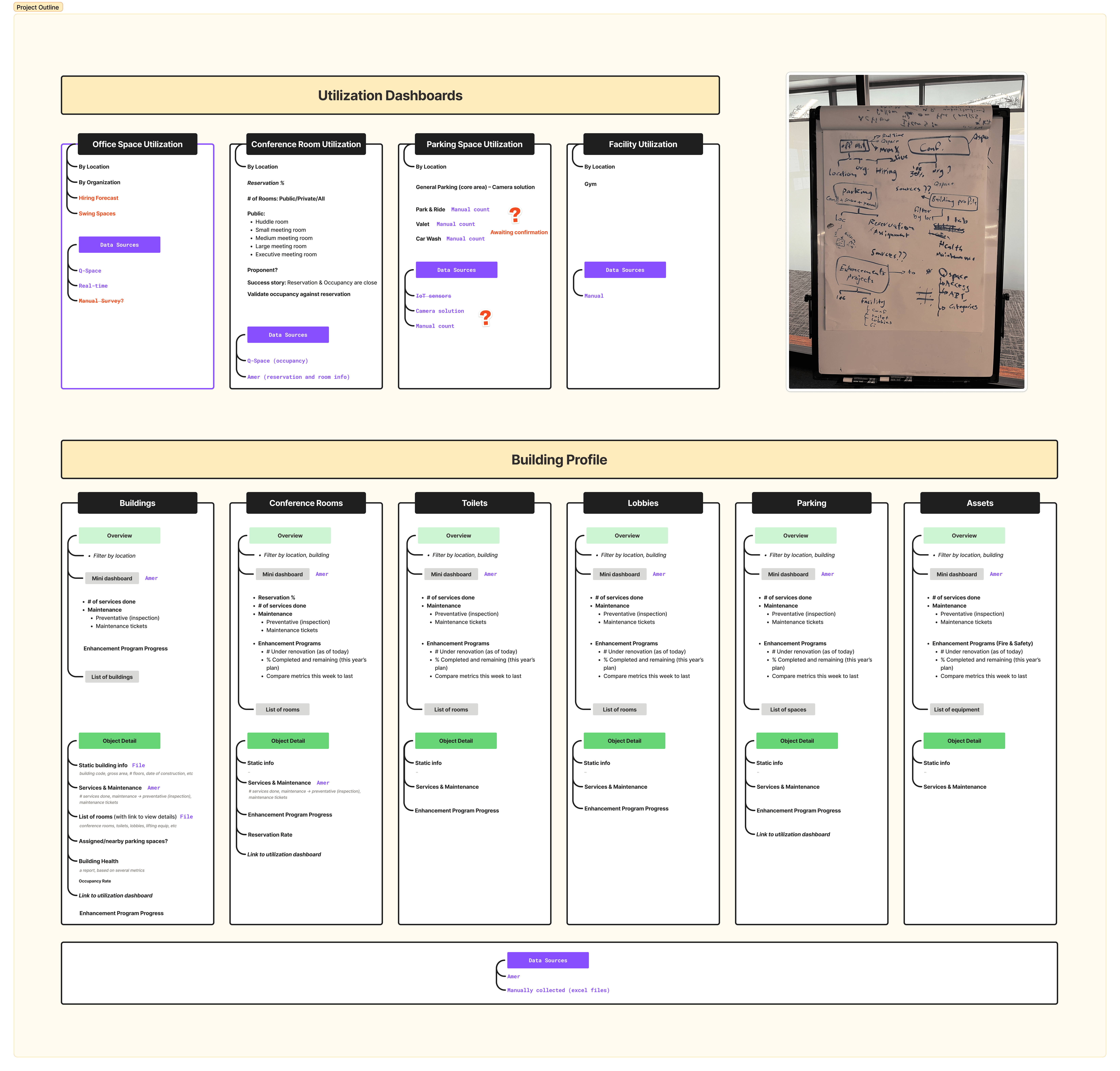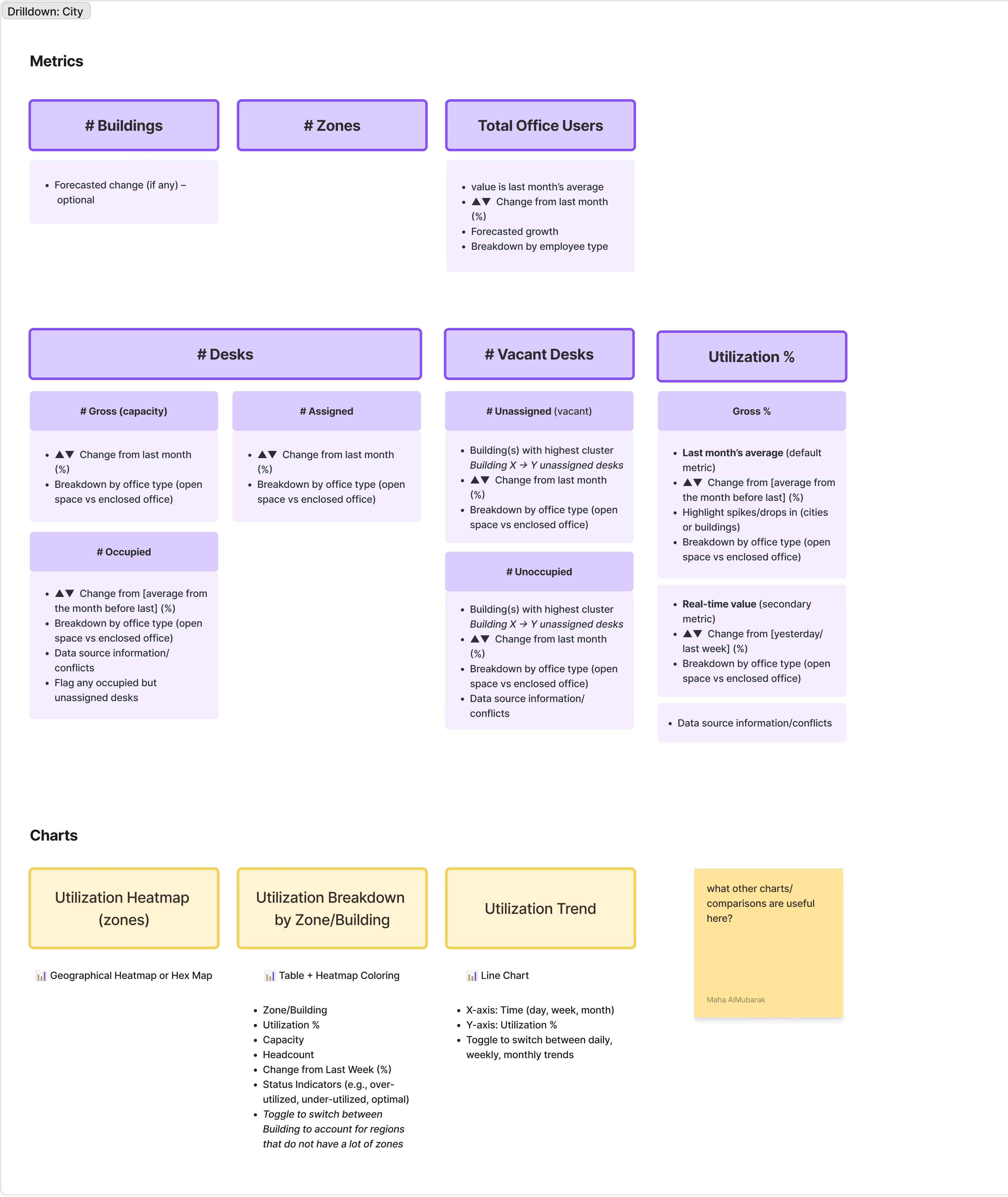 Before any UI was designed, I had to understand how the department’s data fit together. I mapped the hierarchy of the metrics they used to measure, for this example, the office space occupancy. I clarified how occupancy sensors, network analytics, and manual records aligned. This work shaped the structure of the utilization dashboard and ensured every metric had a clear definition.