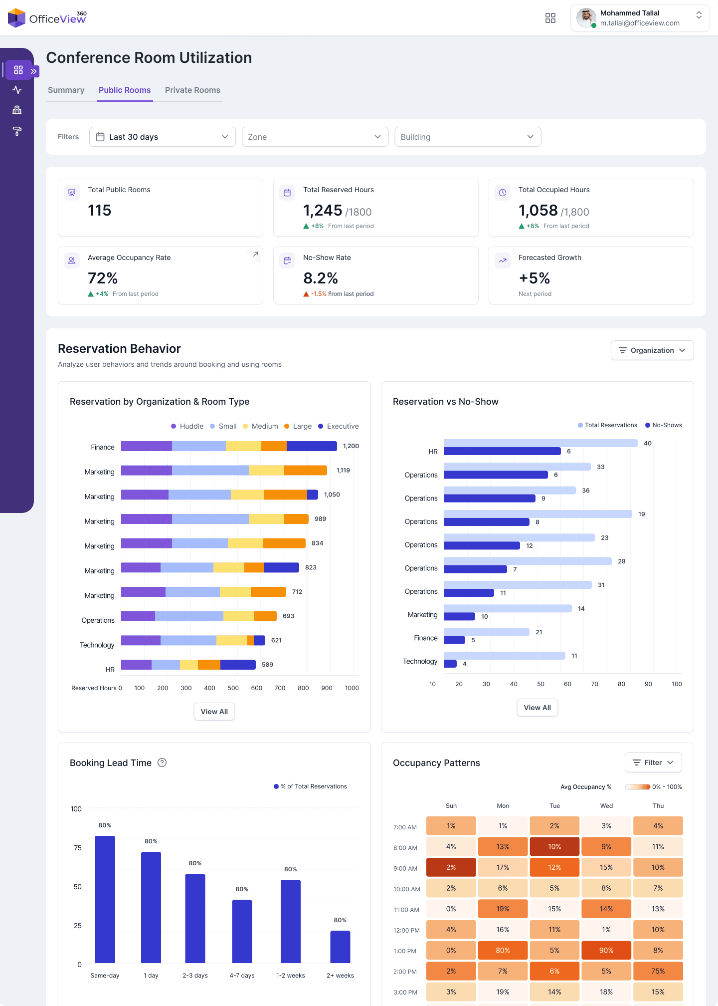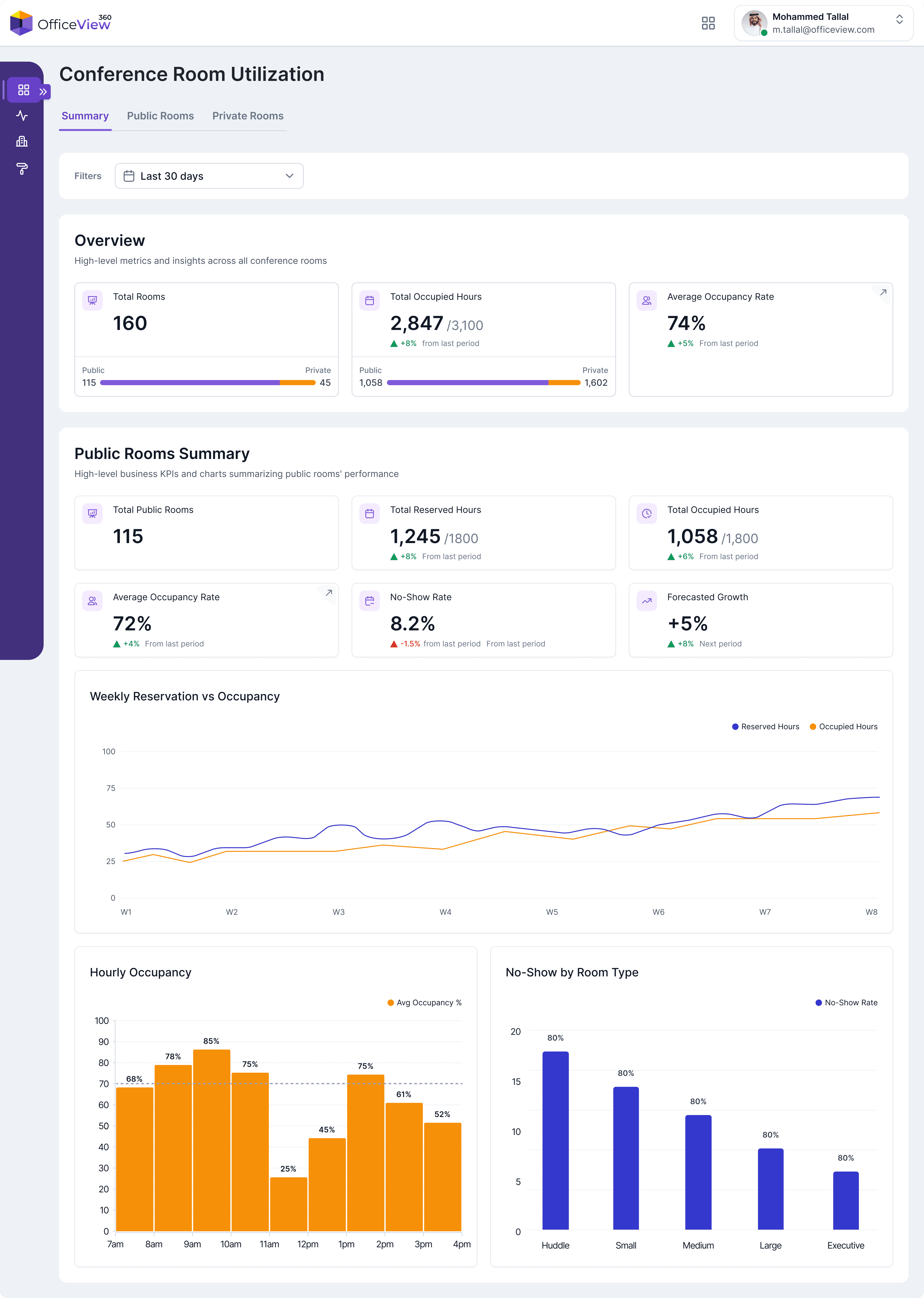 Conference Rooms Summary: A snapshot of reservation activity vs. actual occupancy behavior across meeting spaces