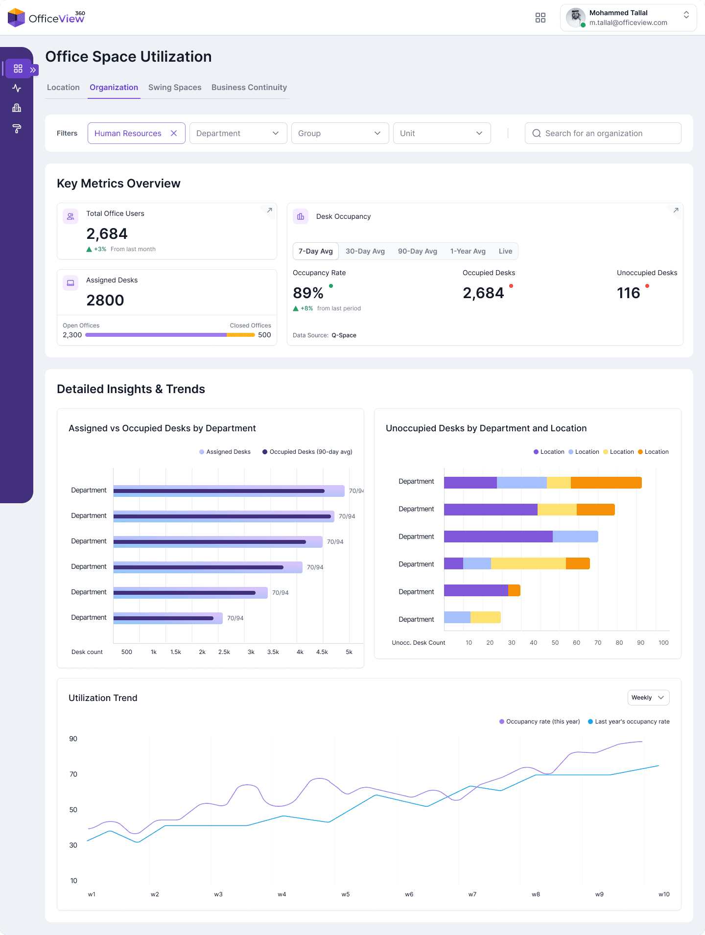 Organization View: The dashboard shifts to show utilization by department and organizational structure