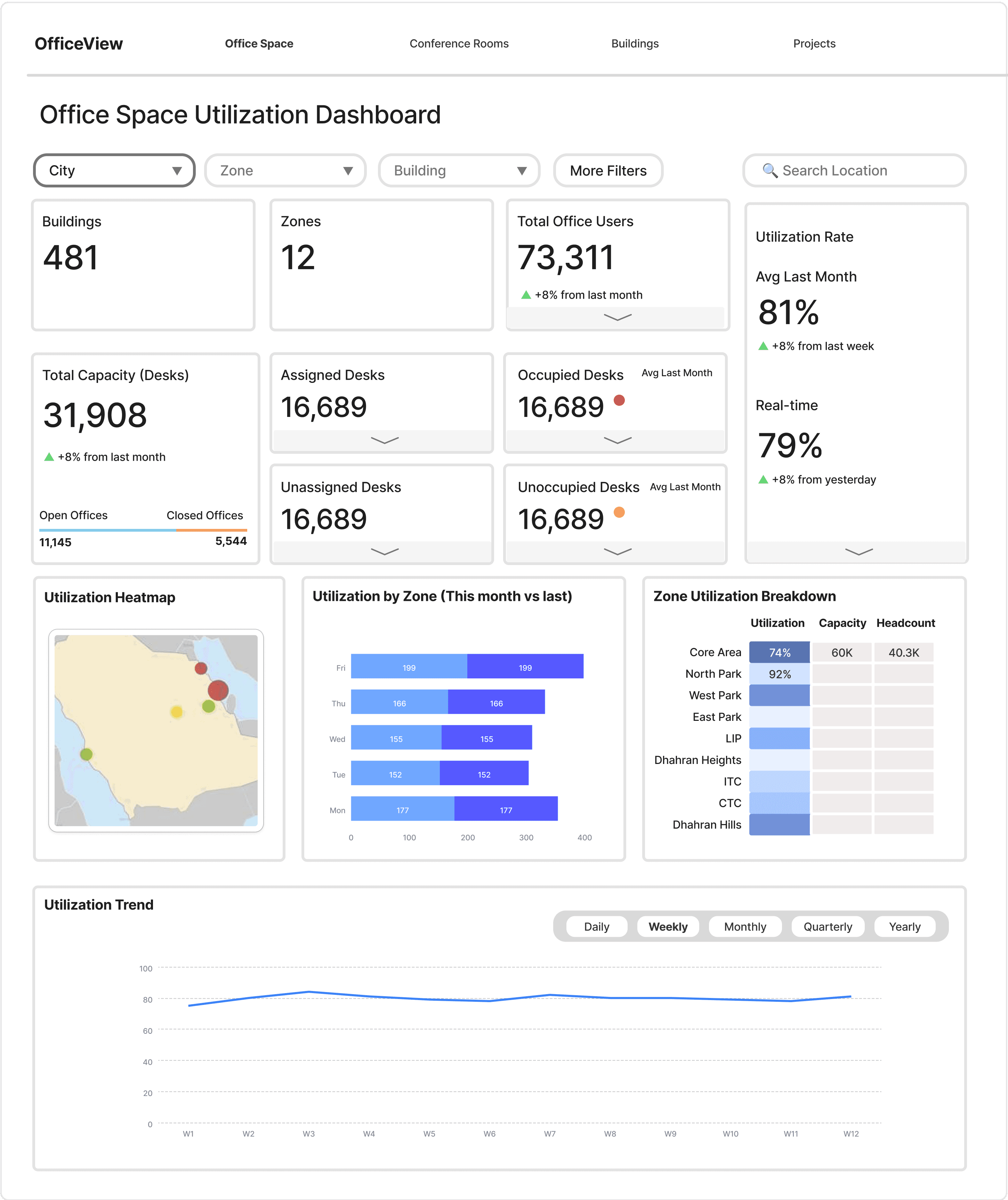 Low-fidelity design showing the location-based view of the office space utilization dashboard