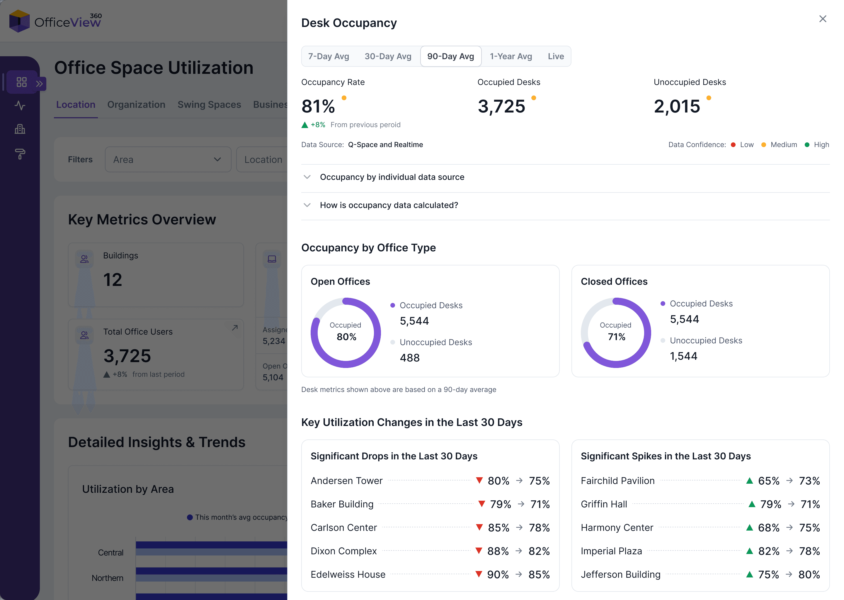 The occupancy insights drawer, showing the components of the metric, data source information, and key changes across buildings